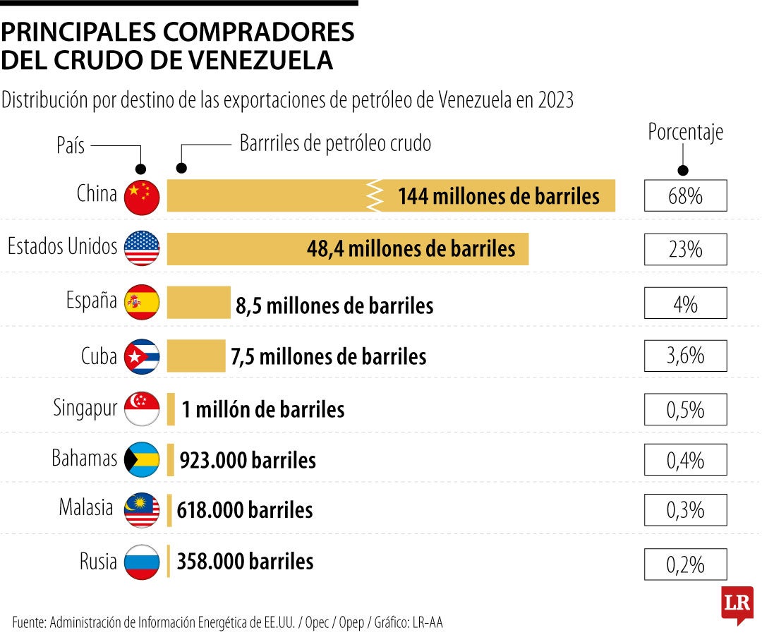 En 2023, Venezuela exportó 211,6 millones de barriles de petróleo crudo y China se consolidó como el principal comprador al importar 144,1 millones de barriles, equivalentes a 68% del total exportado; Estados Unidos ocupó el segundo lugar con 48,5 millones de barriles, cerca de 23%; España y Cuba representaron cada uno alrededor de 4%; y, el resto de los países apenas absorbió 1% de las exportaciones del país.