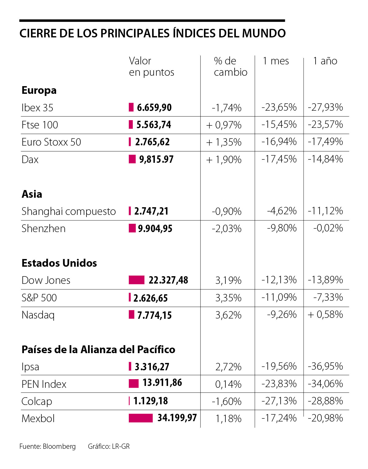 Con cerca de 36.000 muertos y más de 768.370 contagiados, de los cuales se han recuperado 160.181, el Covid-19 le dio un respiro a los principales mercados del mundo que lograron recuperarse un poco al cierre de la jornada de ayer. Por ejemplo, el índice Dax de Alemania terminó el día con un alza de 1,90%; el Ftse 100 de Reino Unido, con 0,97%; el Cac 40 de Francia, con 0,62%; y el Itlms de Italia, el país más golpeado por el virus en Europa, también finalizó la jornada en verde con 0,26%.