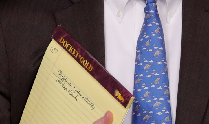 El asesor se quedó de pie en el podio apoyando su libreta de notas en el pecho, solo se alcanzaban a ver un par de lineas que fueron más claras al momento de ampliar la imagen.