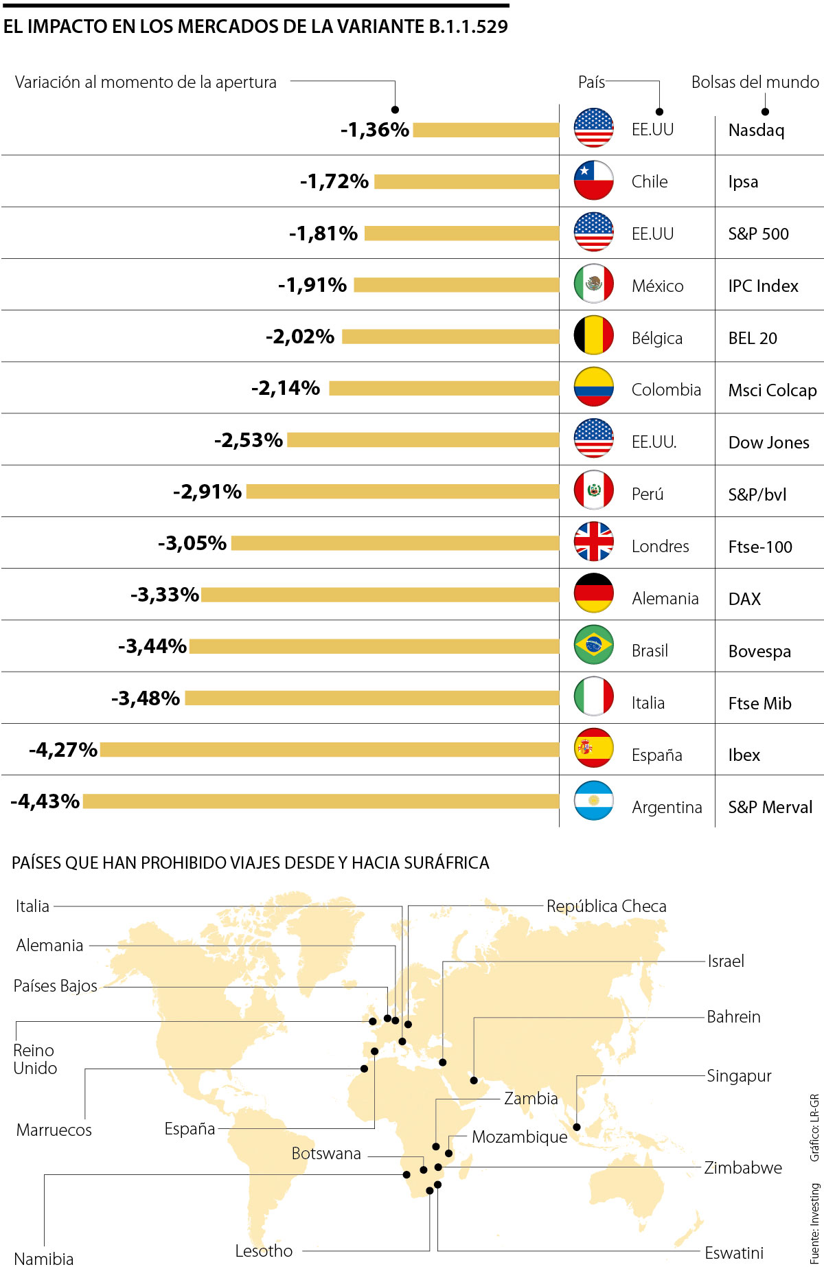 La nueva variante de covid-19 que, posiblemente, podría ser más contagiosa y más resistente a las vacunas, ha hecho que varios países comiencen a tomar medidas para evitar su propagación. Y el impacto inmediato fue una caída generalizada de las bolsas.