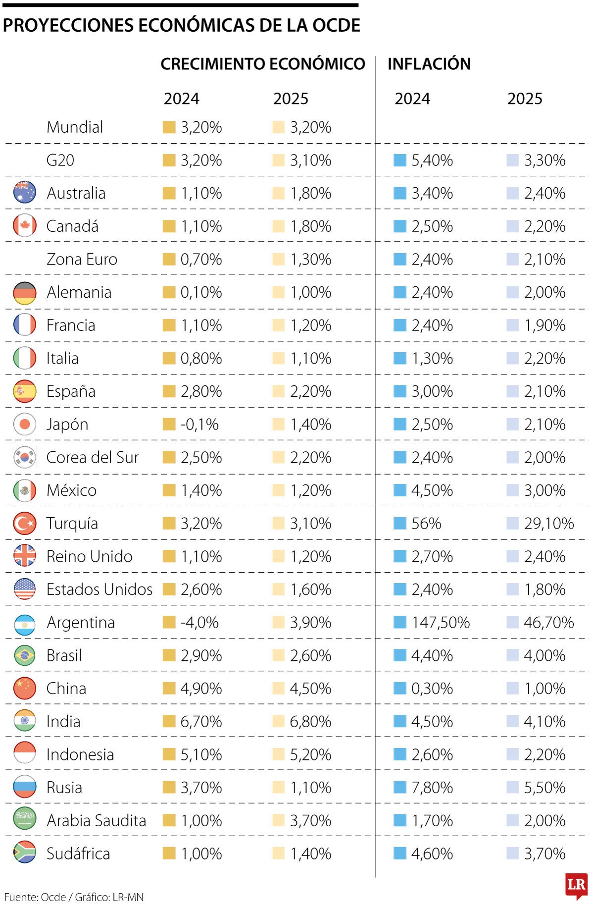 La Ocde también presentó sus proyecciones del IPC en 2024 y 2025. En el G20 sería 5,4% para este año y se desaceleraría en 2025 a 3,3%.Para los seleccionados en América Latina la proyección de este año es 4,5% en México, 147,5% y Brasil 4,4%.
