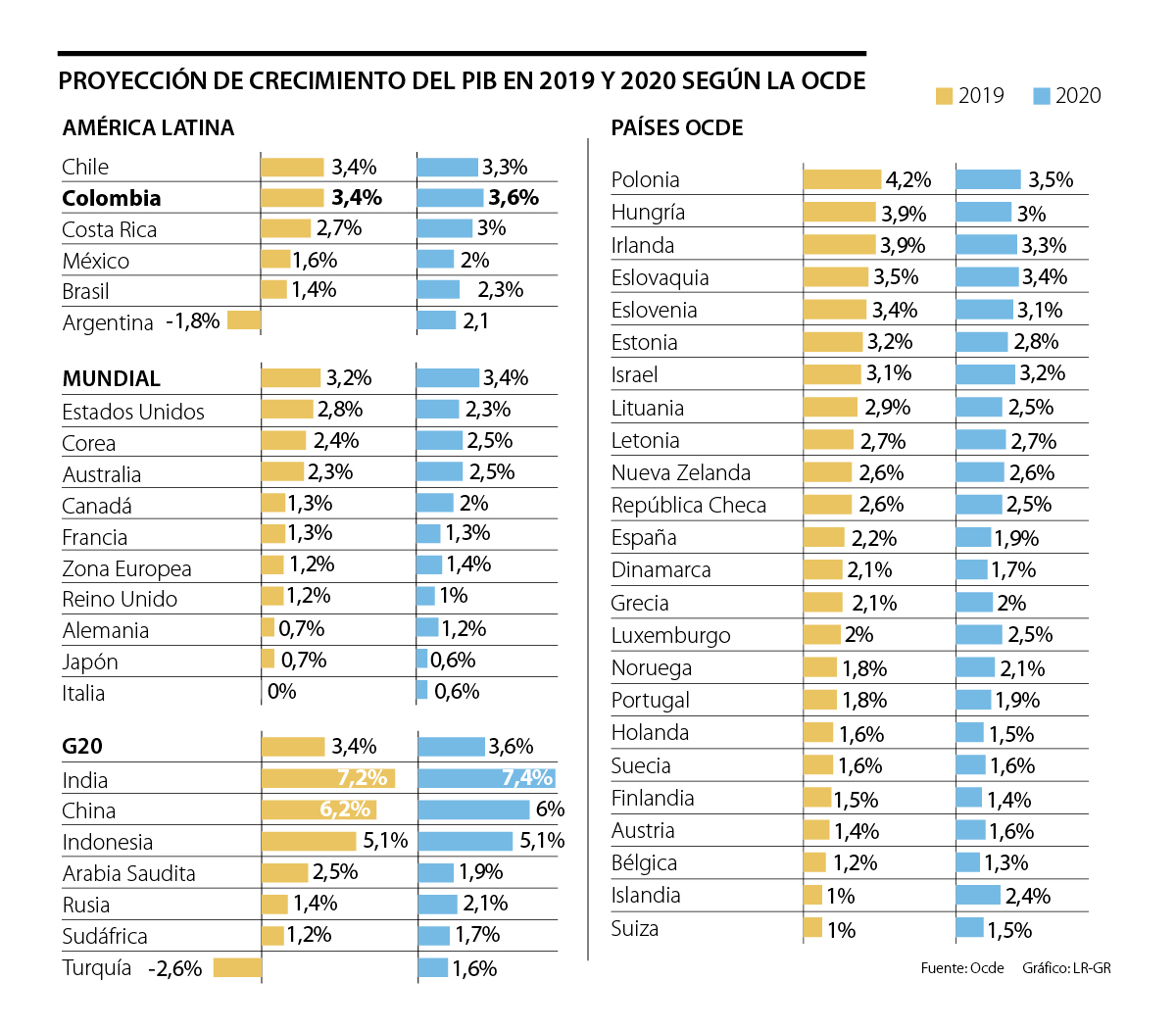 Sin embargo, en medio de este contexto difícil para el mercado mundial, para la Ocde, Colombia tendrá un buen desempeño económico durante 2019 y 2020, pues proyectó su crecimiento en 3,4% para este año (0,1 puntos porcentuales más que lo indicado hace seis meses) y 3,6% para 2020. Con esta previsión, Colombia es el segundo país de la región valorado por la Ocde que más crecerá este año.