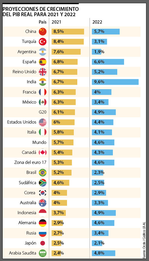 Según la Ocde, el fuerte crecimiento para este año se debe a la continuidad del despliegue de las vacunas y a la reanudación gradual de la actividad económica.