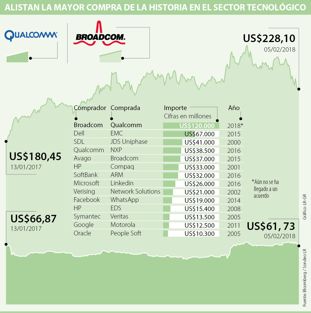 El fabricante estadounidense de circuitos integrados para comunicaciones de banda ancha Broadcom elevó en 24% su oferta para adquirir la compañía estadounidense de microprocesadores Qualcomm. El monto se elevó este lunes a US$121.000 millones, la oferta más alta en la historia del sector tecnológico. La propuesta equivale a US$82 por cada acción de Qualcomm, de los que US$60 serían en efectivo y los US$22 restantes serían en acciones de Broadcom.
