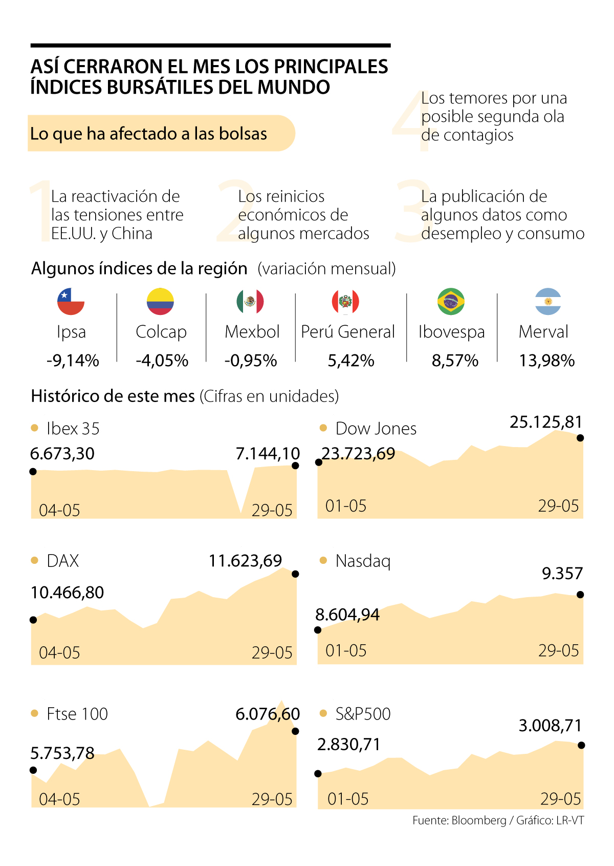 El Nasdaq terminó mayo con un aumento de 6,45%, el Dow Jones cerró el mes con un avance de 6,99% y el S&P 500 con 3,57%. Estos incrementos se dieron a pesar del nerviosismo que se dio entorno a una posible reactivación de las tensiones entre EE.UU. y China; la publicación de algunos datos económicos negativos para la mayoría de las economías; y los temores por una posible segunda ola de contagios, luego de los reinicios económicos de algunos países.