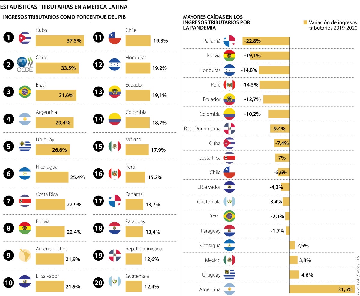 Agrega que la relación media entre impuestos y PIB de los 16 países incluidos en el informe del organismo sigue siendo baja en comparación con el resto del mundo, ya que se sitúa en 19,8%, frente a la media de la Ocde de 33,5% para 2020.