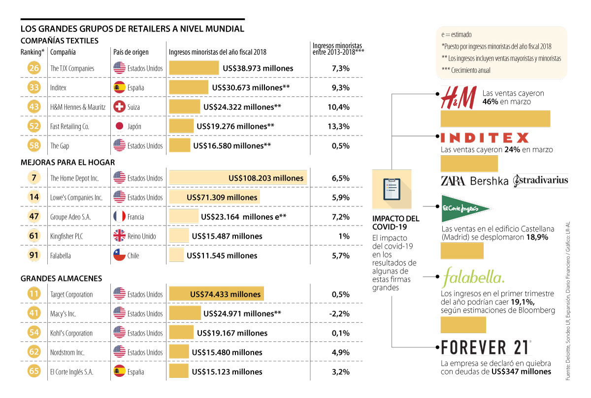 El mal momento que atraviesa el sector de retail se refleja en que según “un informe elaborado por Boston Consulting Group (BCG) se estima que el comercio textil perderá entre 25% y 35% de su negocio a nivel mundial este año, lo que supondrá un descenso de ventas de entre US$450.000 millones y US$600.000 millones”, citó el diario Expansión.