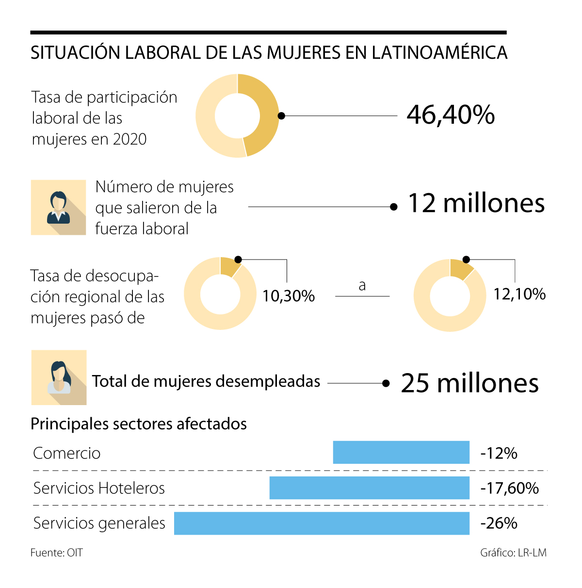 La tasa de desocupación de las mujeres en la región aumentó a 12,1% durante el año pasado, por encima del promedio de desocupación general, que subió a 10,6%, según se destacó en informe de la OIT. Esto significó que aproximadamente 1,1 millones de mujeres cayeron en desempleo.