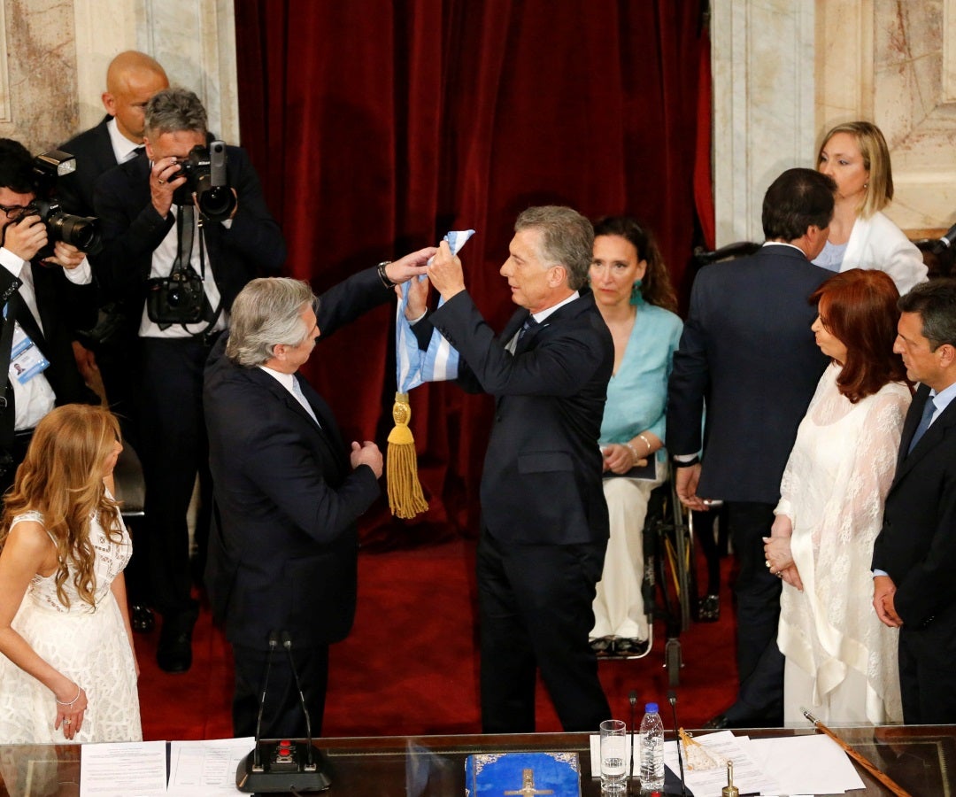 Foto: Reuters / Momentos en que el presidente saliente Mauricio Macri le pone la banda presidencial a Alberto Fernández