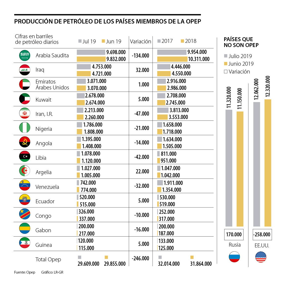 La Organización de Países Exportadores de Petróleo (Opep) reveló en su informe mensual que la producción de sus países miembros cayó 246.000 barriles de petróleo diarios al pasar de 29.855.000 de barriles en junio de este año a 29.609.000 en julio de este año. Además, la Opep informó que rebajó en 40.000 barriles de petróleo por día (bpd) su previsión de crecimiento de la demanda para 2019, mientras que el mercado tendrá un superávit para 2020.