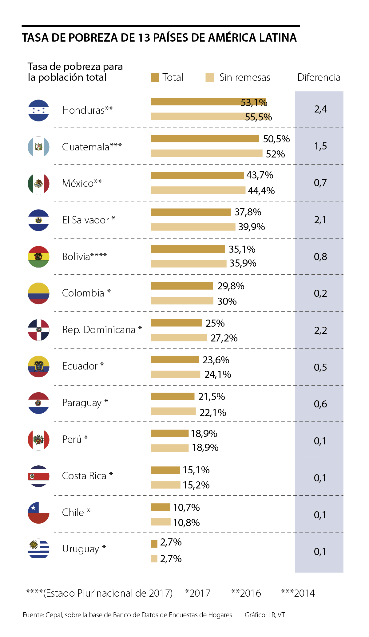La apuesta por construir una economía más igualitaria e innovadora que plantea Ha-Joon Chang debería ser aplicada en países donde aún hay altas tasas de pobreza como Honduras (53,1%), Guatemala (50,5%), México (43,7%), El Salvador (37,8%) y Bolivia (35,1%), de acuerdo con una publicación de la Cepal (ver gráfico).