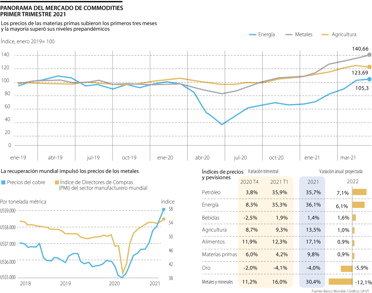 Según las estadísticas del Banco, los repuntes en la actividad económica y los cambios en la demanda en el sector de las materias primas durante el primer trimestre del año, más específicamente en los rubros de petróleo, cobre y alimentos básicos, provocaron un incremento de los precios que llevó a que registraran los niveles que tenían antes de la pandemia.