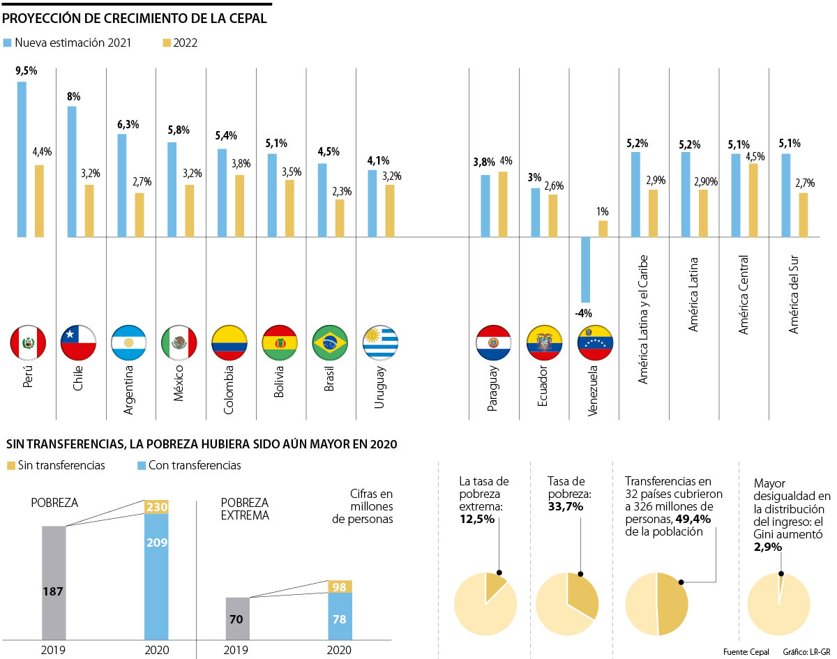 Con esas cifras, la Cepal concluyó que las transferencias y ayudas a las familias y hogares más vulnerables beneficiaron a 326 millones de personas, es decir, 49,4% de la población. Sin embargo, la desigualdad en la distribución del ingreso aumentó (2,9% del índice de Gini).