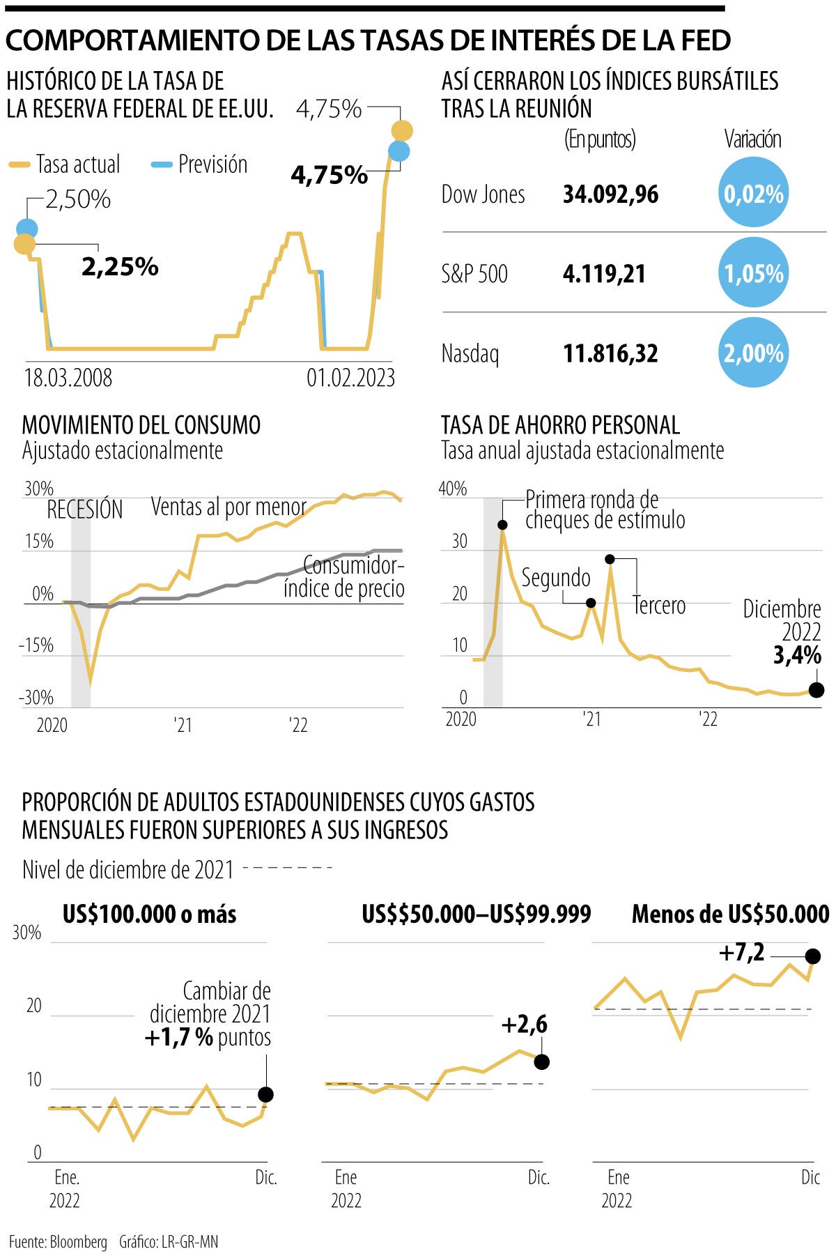 Los responsables de la política monetaria de la Fed elevaron el objetivo de su tasa de referencia en un cuarto de punto porcentual, hasta un rango de entre 4,5% y 4,75%. Este aumento se produce tras un alza de medio punto en diciembre e incrementos anteriores de 75 puntos básicos.