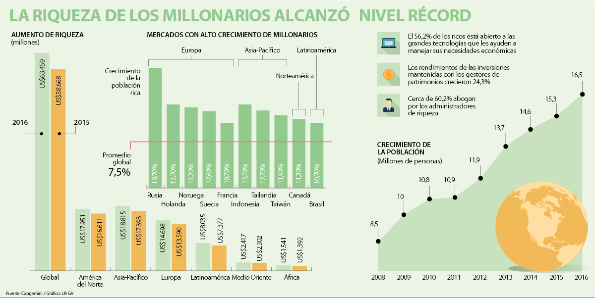 Cada año, los millonarios a nivel mundial acumulan más capital. Así lo reveló el último reporte de Capgemini, el cual detalló que 16,5 millones de personas, en mejores condiciones económicas, manejaron US$63.500 millones en 2016, un incremento de 7,8% comparado con 2015.