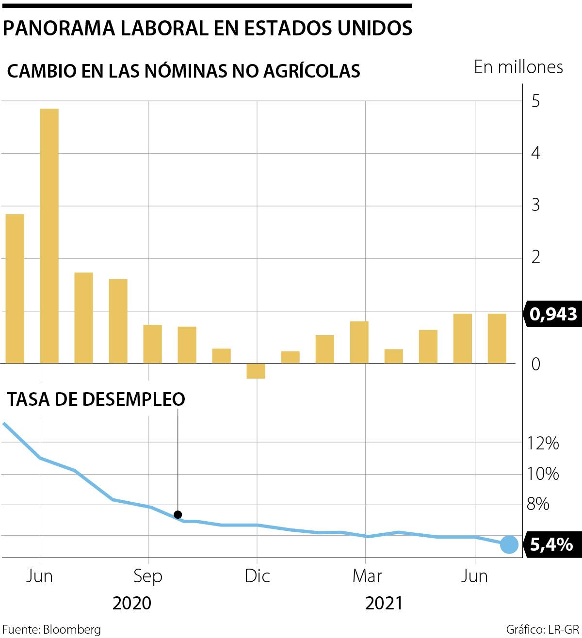 El informe de empleo siguió a la noticia de la semana pasada de que la economía se recuperó por completo en el segundo trimestre de la fuerte pérdida de producción sufrida durante la breve recesión pandémica. El crecimiento económico de este año se estima en alrededor de 7%, el mayor nivel desde 1984. La salud del mercado laboral tendrá un gran peso en los próximos pasos de la Fed sobre su política monetaria.