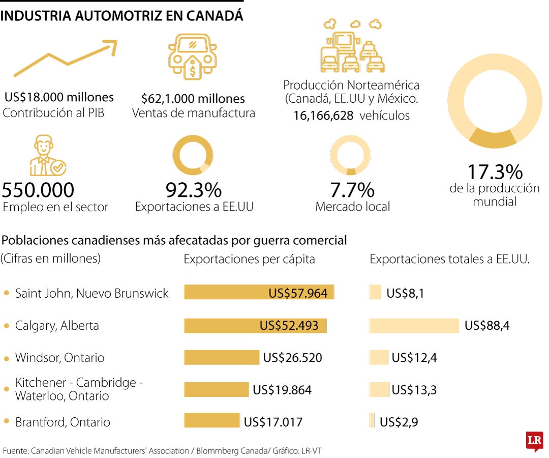 Por ello, las tarifas impuestas, en algunos casos, podría elevar el costo final de un vehículo hasta en US$5.000. La industria automotriz canadiense emplea directamente a más de 130.000 trabajadores, cifra que asciende a 550.000 si se incluye la cadena comercial y de servicios. En 2023, los vehículos representaron el segundo producto de exportación del país, de los cuales 93% tuvo como destino el mercado estadounidense. En Ontario, los automóviles lideran las exportaciones con el 28,9% del total. El cruce entre Detroit, Michigan y Windsor, Ontario, unido por el Puente Embajador, constituye el principal corredor comercial entre ambos países. En 2023, más de 2,5 millones de camiones lo atravesaron, muchos de ellos vinculados directamente a la industria automotriz.