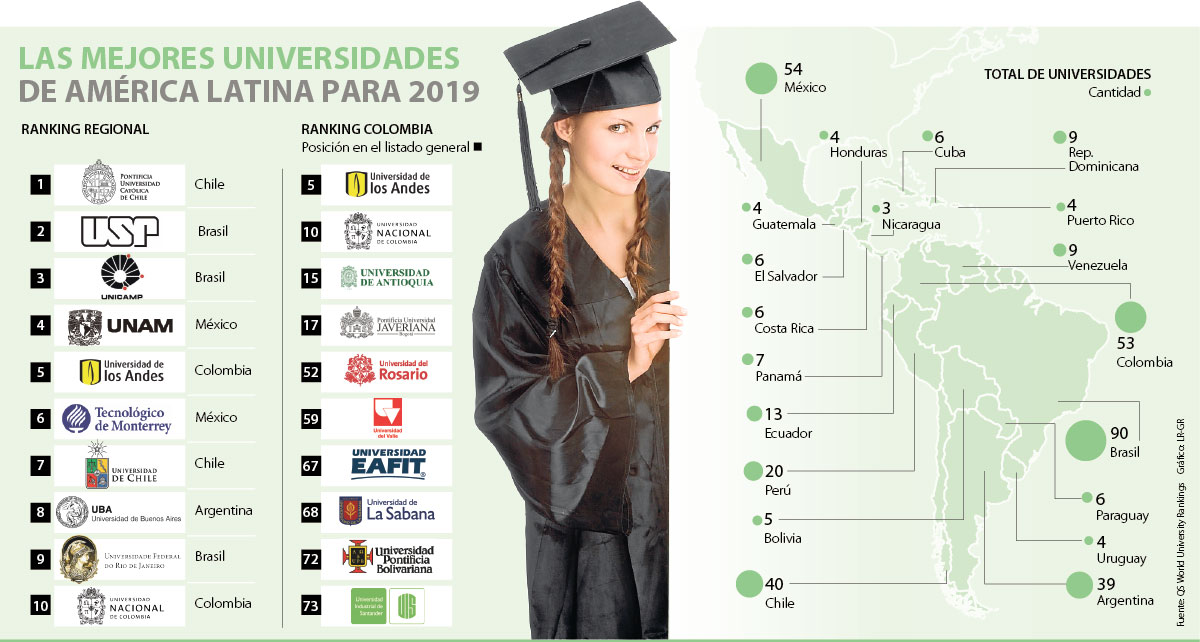 El país cuenta con 53 instituciones dentro del listado de las 400 del ranking de América Latina, factor que la convierte en la tercera nación con más universidades de la región frente a un total de 20, solo por detrás de Chile (54) y Brasil (90).