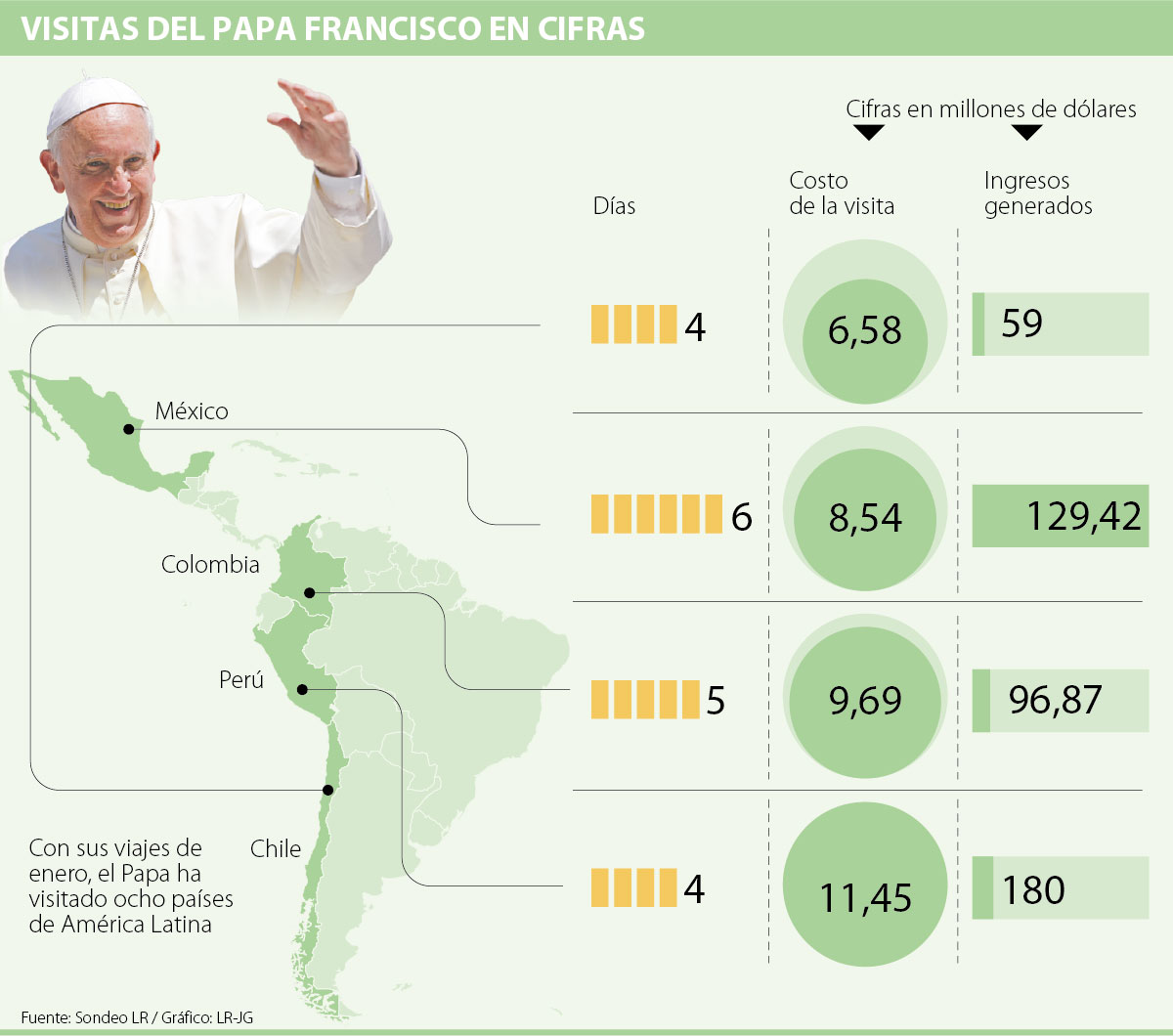 Según las cifras presentadas por México y Colombia después de la visita papal, en el primero los ingresos ascendieron a US$129,42 millones, mientras que el segundo fueron de US$96,87 millones.