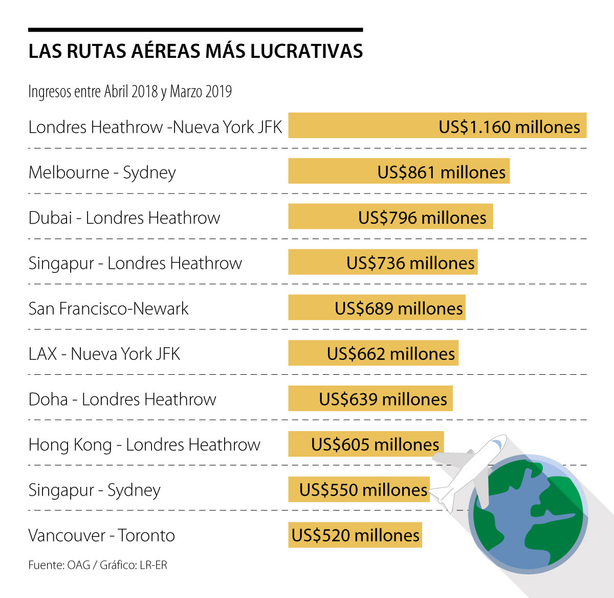 “Para cada aerolínea hay una pequeña selección de rutas lucrativas donde la ventaja competitiva, las circunstancias del mercado o la competencia limitada generan ingresos muy atractivos”, explicó John Grant, de los analistas de OAG.