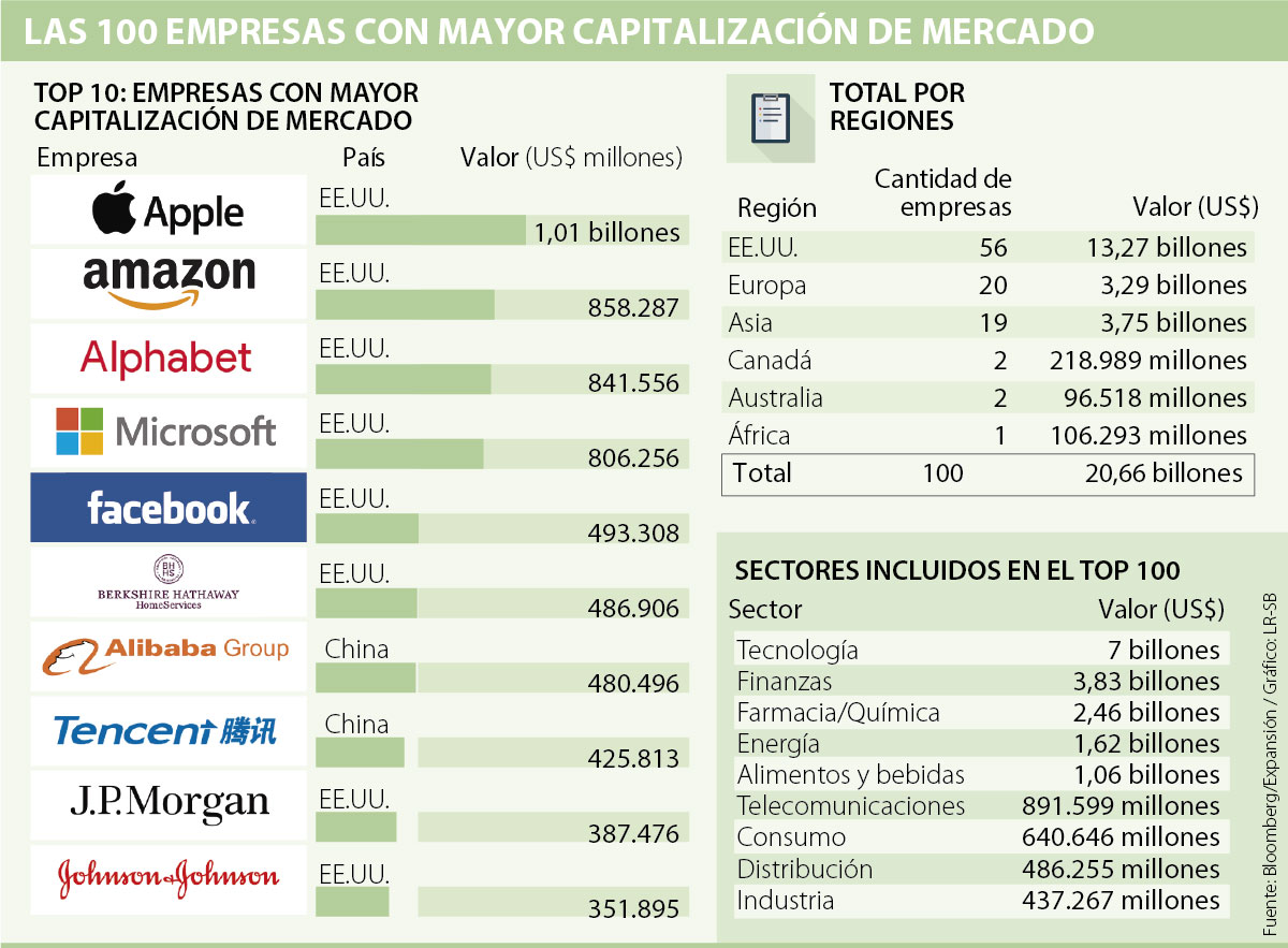 Tienen origen estadounidense 56 de las 100 empresas con mayor capitalización bursátil