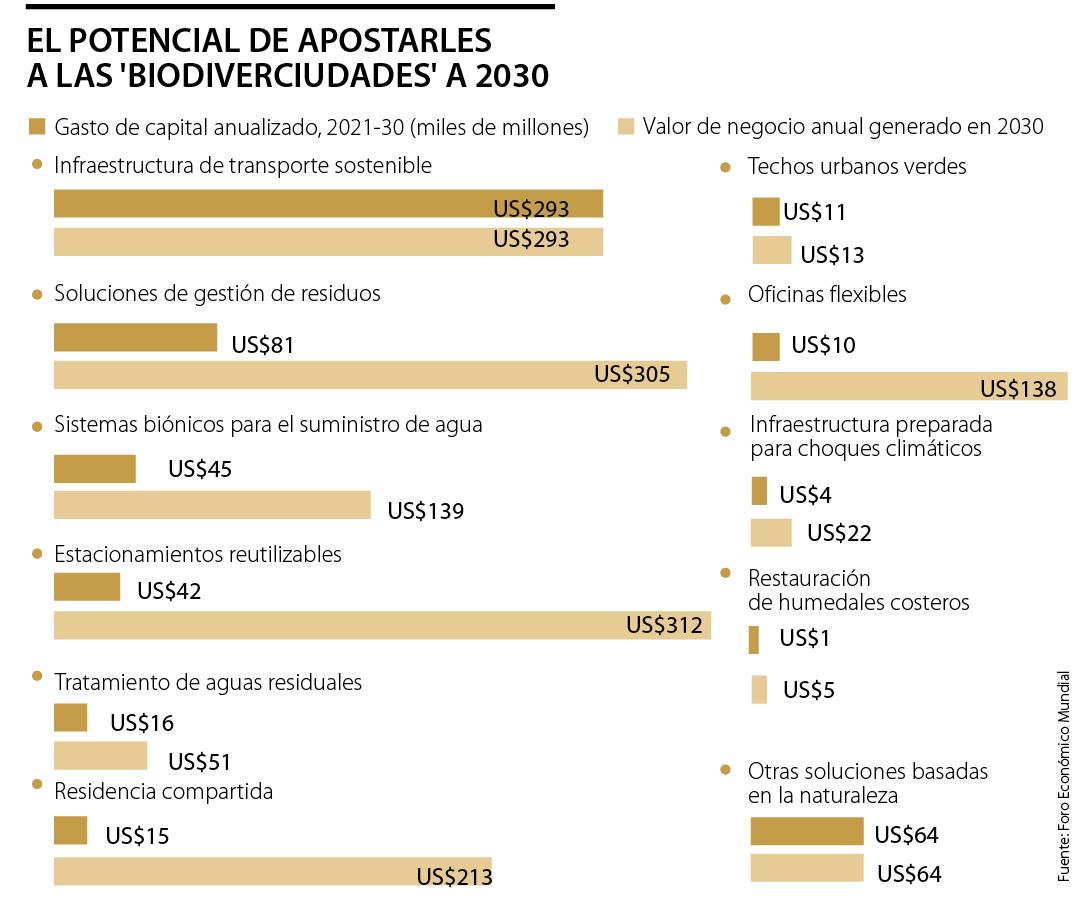 Invertir en infraestructura sostenible es una necesidad cada vez más latente para los gobiernos a lo largo del planeta, y mediante la visión integral que contempla la iniciativa de ‘BiodiverCiudades’se podría generar un valor comercial anual global que ascendería a US$1,5 billones hacia 2030. Esta es una de las principales conclusiones de una investigación liderada por el Instituto Alexander von Humboldt, el Gobierno de Colombia y el Foro Económico Mundial, presentada ayer en el marco de la programación de encuentros virtuales del foro este año.