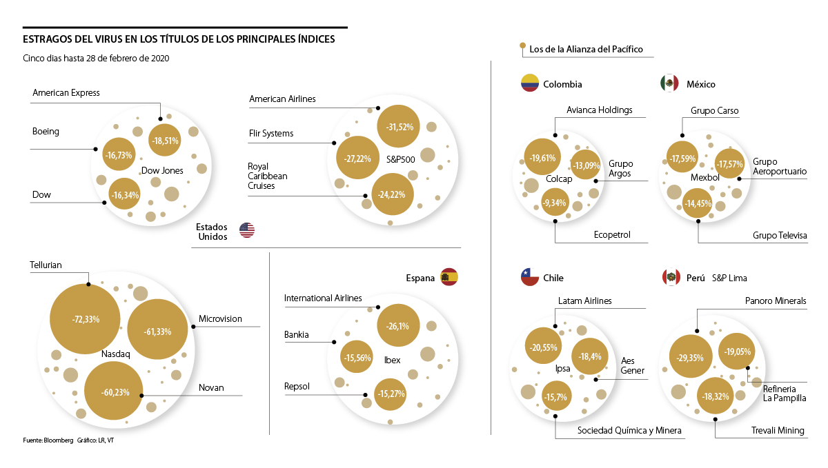 Con base en el comportamiento de los títulos locales, Wilson Tovar, jefe de investigaciones económicas de Acciones y Valores, aseguró que es “evidente que las empresas más afectadas son las del sector aéreo y de turismo, pero esta caída más allá del efecto del Covid-19 también es producto de que varias compañías ha entregado resultados financieros consolidados de 2019. Muchas de las cifras alcanzadas no eran las esperadas por los analistas”.
