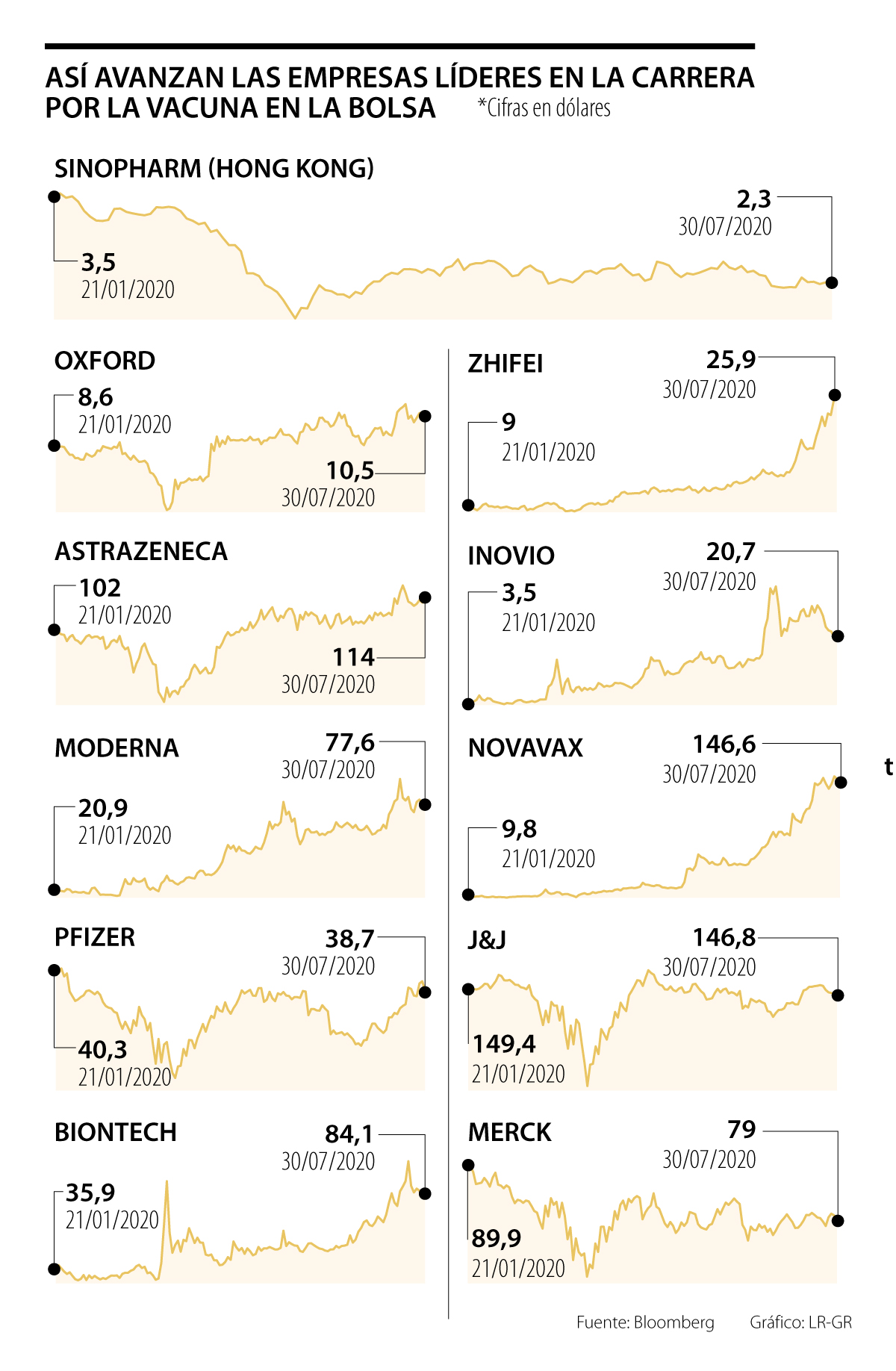 Según la Organización Mundial de la Salud (OMS), hay seis candidatas a vacuna que están en la fase tres del proceso. Entre los laboratorios que están en este punto se encuentran la Universidad de Oxford/AstraZeneca, Moderna y Pfizer y BioNTech, las cuales han registrado aumentos en su cotización.