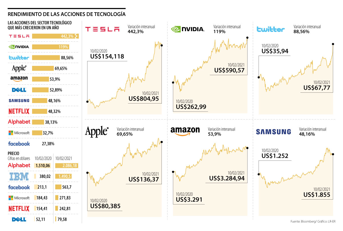 La acción de Samsung, aunque un poco más abajo en el listado también logró rendimientos positivos en los últimos 12 meses, pues pasó de US$1.252 en febrero de 2020 a US$1.855 en el mismo mes de 2021, con una variación de 48,16%.
