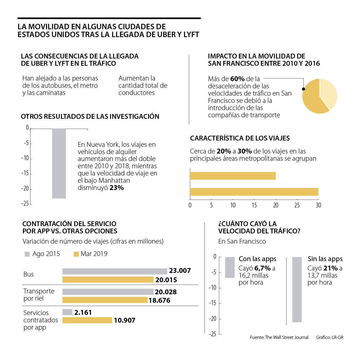 A las anteriores ciudades en donde se ha registrado un efecto negativo en la movilidad desde la incursión de las aplicaciones de transporte se le suma Nueva York. “Los viajes en vehículos de alquiler aumentaron más del doble entre 2010 y 2018, mientras que la velocidad de viaje en bajo Manhattan disminuyó 23%”, según WSJ.