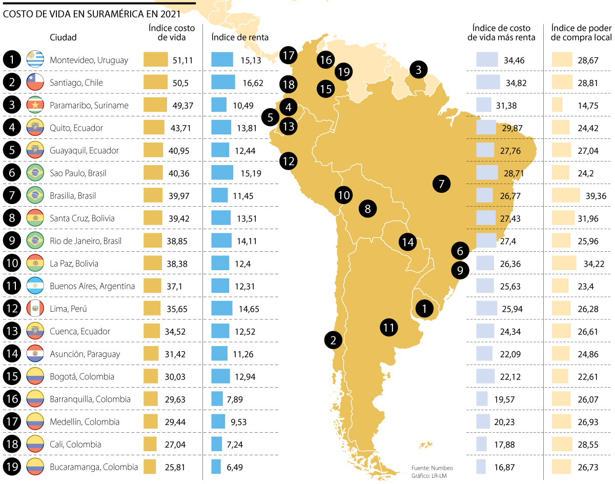 Esto, a través del Índice de Costo de Vida para 2021, que fue encabezado por la capital Uruguaya, Montevideo, y cerrado por las cinco ciudades colombianas incluidas en la medición: Bogotá, Barranquilla, Medellín, Cali y Bucaramanga.