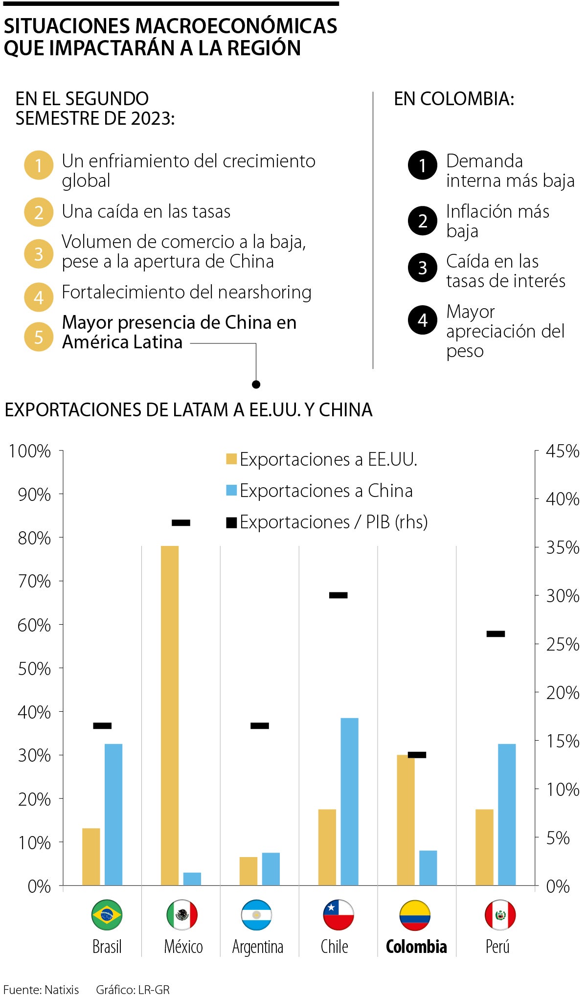 Precisamente, esta es una de las cinco situaciones que aparecen en el último reporte de Natixis y que, según indica, podrían impactar a la región durante el próximo semestre (junio-diciembre). El informe dice que el crecimiento global se enfriaría en lo que resta del año y que, incluso, se podría hablar de una recesión de baja intensidad a finales del 2023 o principios del 2024.