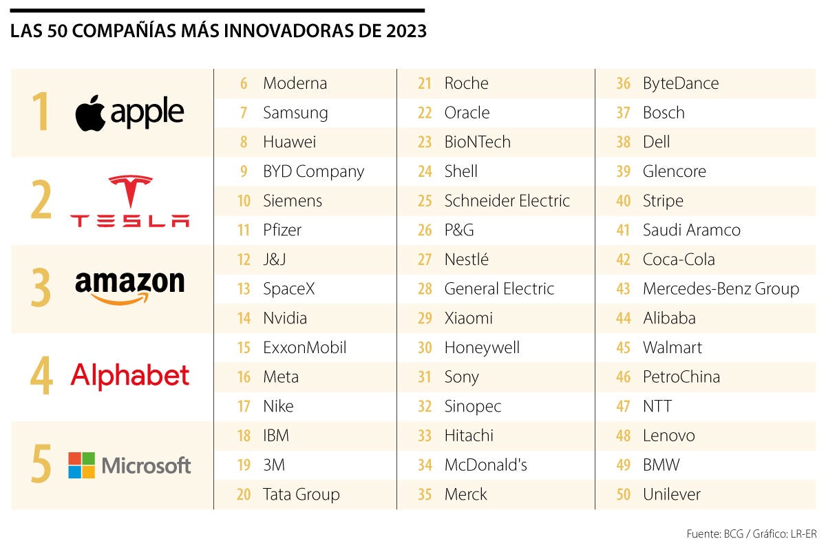 El primer lugar se lo lleva la gigante de Steve Jobs, Apple. La compañía no solo es la de mayor innovación, sino también la de mayor capitalización en el mercado global, unos US$2,69 billones para este año. La tecnológica destaca por sus dispositivos móviles: celulares y tabletas, así como portátiles y computadores de mesa. Entre sus últimas apuestas está el uso de chips hechos en Estados Unidos, para este fin firmó un contrato con el fabricante de semiconductores Broadcom.