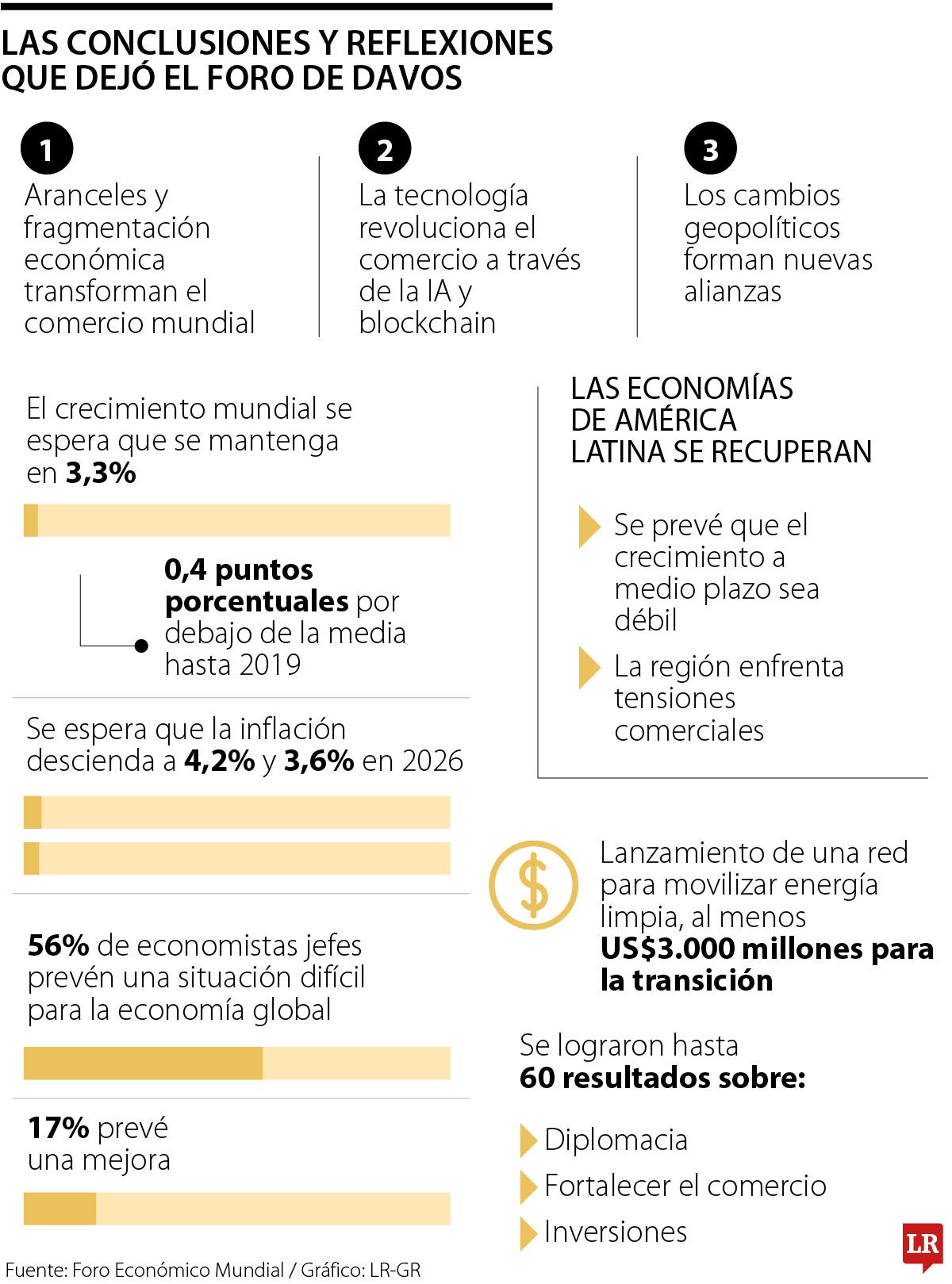 Ayer terminó el Foro Económico Mundial de Davos 2025. Luego de cuatro días en los que 3.000 líderes políticos, economistas y analistas se reunieron para hablar sobre el futuro del planeta, las conclusiones del evento giraron en torno al papel de la IA, el crecimiento de los países, el comercio y la transición energética.