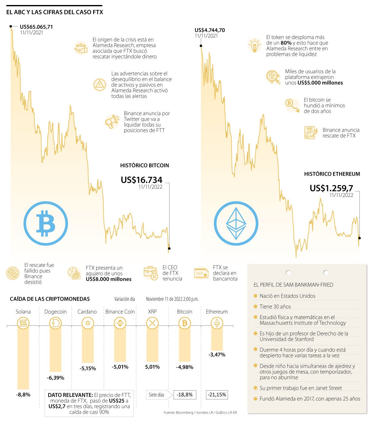 El efecto inmediato fue la fuga de activos y la caída de las monedas digitales. Por ejemplo, el bitcoin volvió a mínimos de hace dos años y su cotización está por debajo de US$20.000. Todas las monedas digitales cerraron en rojo, con el bitcoin liderando las pérdidas, con una baja de casi 5%; al igual que Binance Coin. El ethereum bajó más de 3%. Además, el precio de FTT, la moneda digital de FTX, pasó de US$25 a US$2,7 en tres días, registrando una caída de casi 90%.