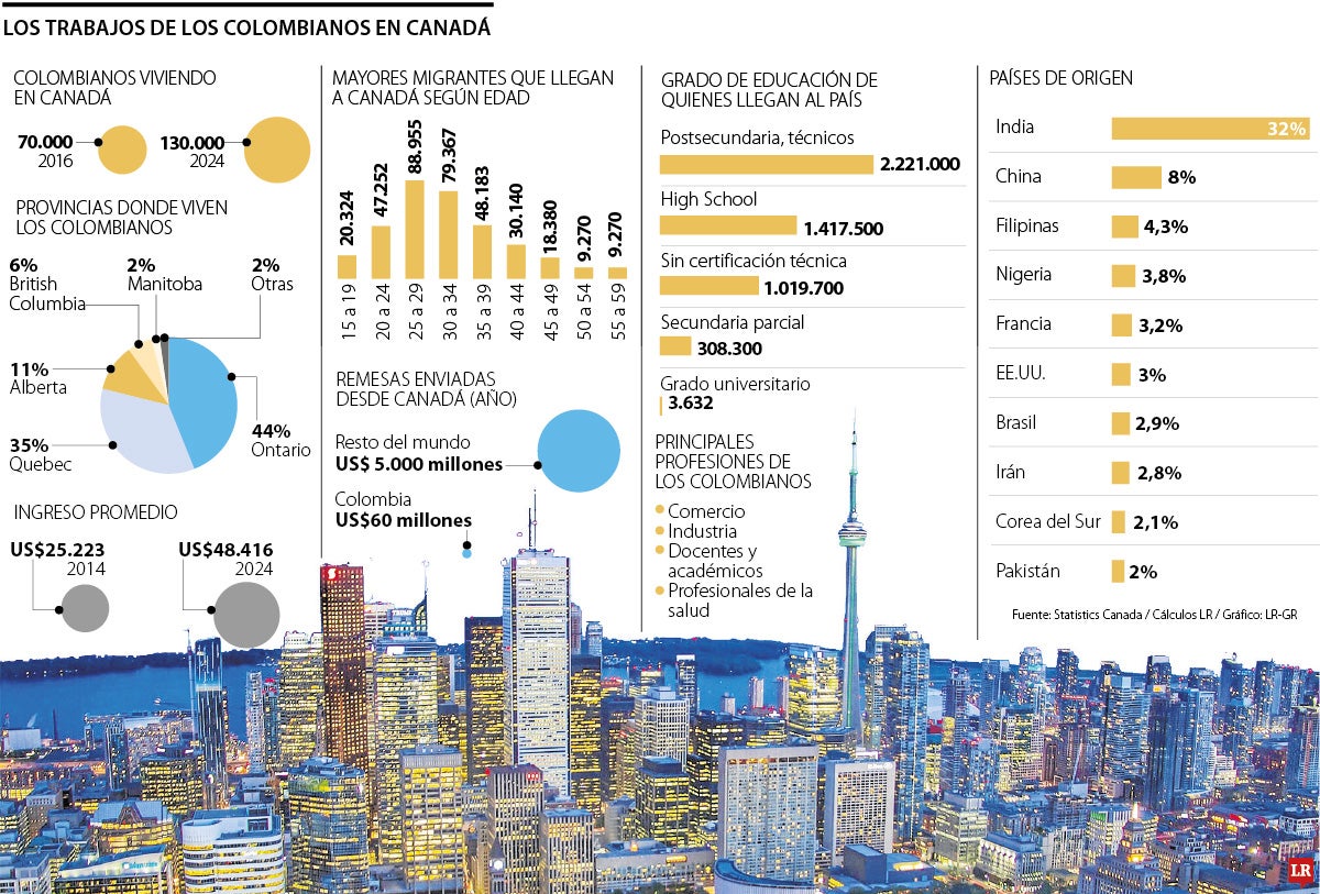 Uno de los datos que más llama la atención de Canadá, con relación a los otros países elegidos para la migración, son los oficios que desempeñan aquí los colombianos. Los cuales cada vez más se concentran en trabajos calificados y del nivel profesional.