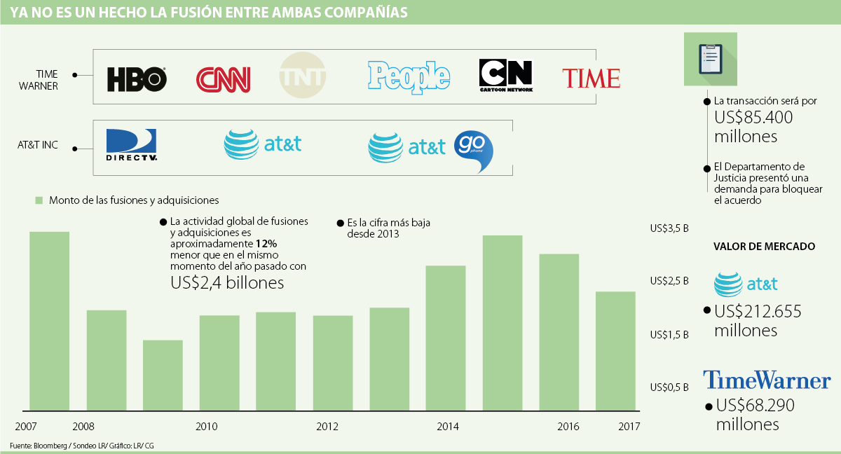 El anuncio de la entidad pone en entredicho la posibilidad de que la compra se ejecute este año. AT&T se consolidaría como un gigante de las telecomunicaciones, no solo si se tiene en cuenta que ya es el mayor distribuidor de telefonía y de televisión paga (tras la adquisición de DirecTV), sino por los servicios que agregaría a su empresa con Time Warner, propietaria de señales como CNN, HBO, TBS además de ser dueña del estudio Warner Bros, que ha producido franquicias como Harry Potter.