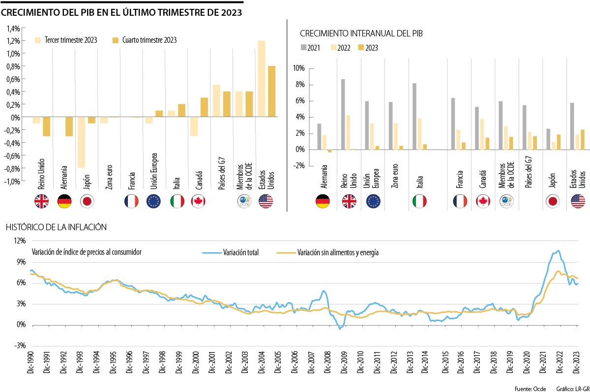 Dicho esto, en el desglose por países del grupo de siete, Japón, Reino Unido y Alemania fueron las únicas en los que no hubo un crecimiento económico. Por el contrario, el decrecimiento de cada una de estas naciones fue de 0,1% para Japón y de 0,3% para Reino Unido y Alemania. En el caso del país nipón, el informe indicó que la contracción se justificó en una caída en la inversión extranjera (o,3%) el gasto privado (0,2%) y el gasto público (0,1%). En cambio, la razón detrás del decrecimiento en el Reino Unido se centra en la disminución de la exportación de servicios entre el tercer y cuarto trimestre de 2023, 6%.