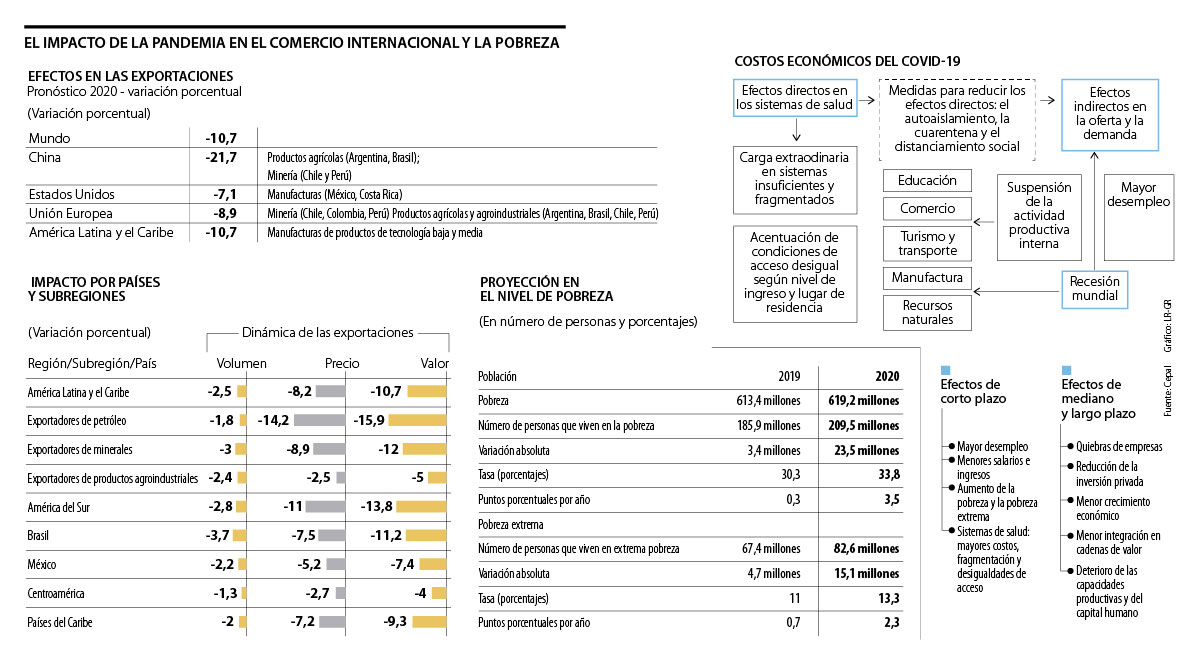 Teniendo en cuenta el impacto en materia de empleabilidad, el organismo internacional señaló que otro de los efectos de la pandemia será el aumento de la pobreza. “Si los efectos del covid-19 llevan a la pérdida de ingresos de 5% de la población económicamente activa, la pobreza podría aumentar 3,5 puntos porcentuales, mientras que se prevé que la pobreza extrema suba 2,3 puntos porcentuales”.