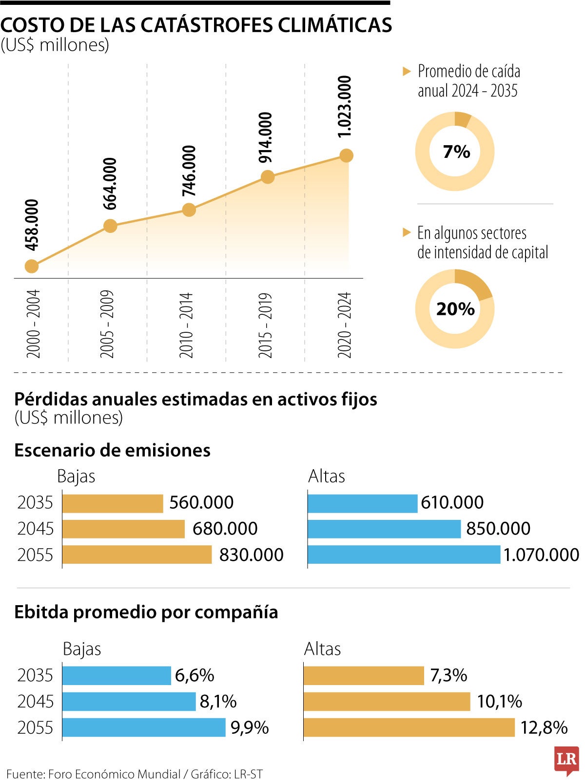 Si no se toma acción, como lo indica el experto, el pronóstico del WEF es que las pérdidas anuales de activos fijos de las empresas que cotizan en bolsa serán por entre US$560.000 millones y US$610.000 millones en 2035, y el ebitda promedio caería entre 6,60% y 7,30% dependiendo si se dan un escenario alto o bajo de emisiones.