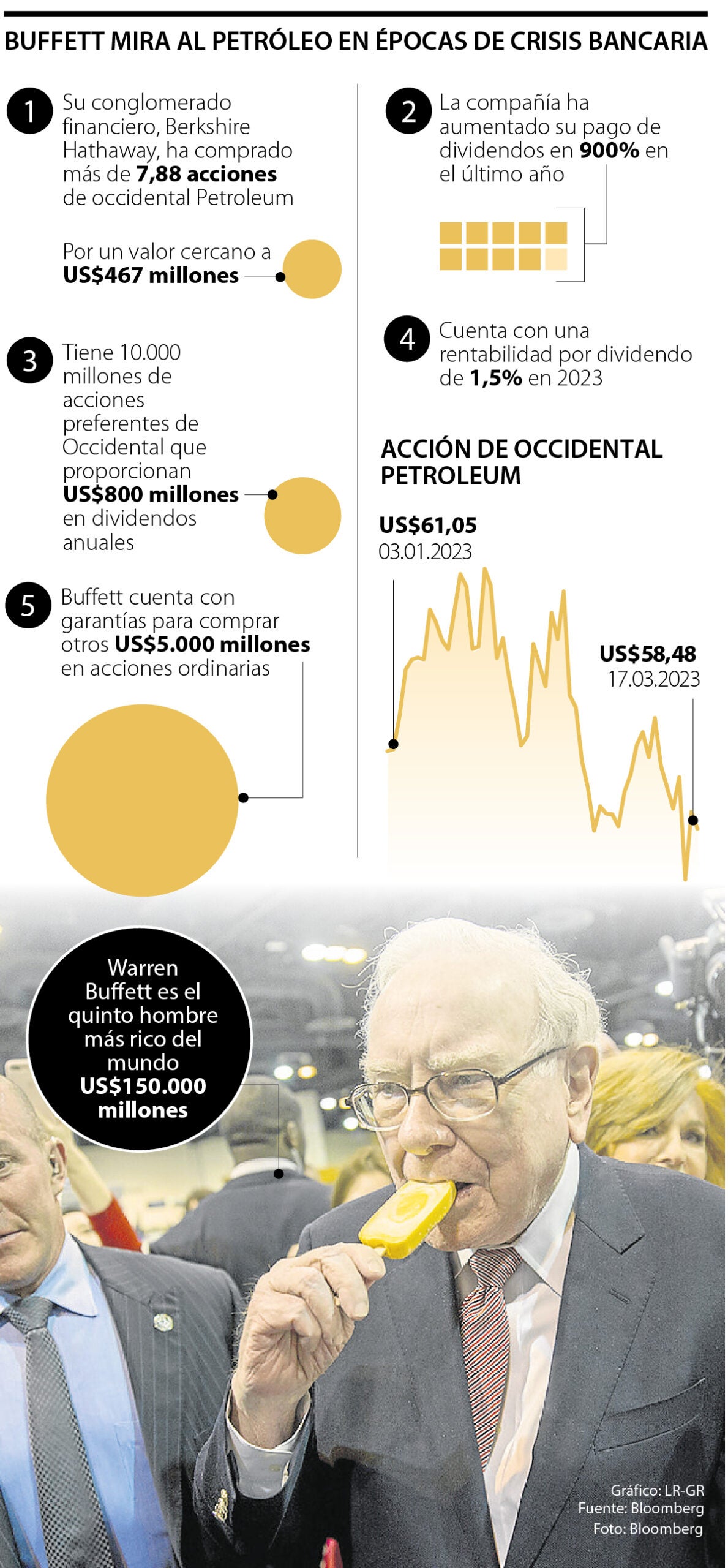 Uno de su principal lema es: “Hay que ser avariciosos cuando otros salgan del mercado”. Lo ha cumplido en los últimos días, y ha salido a pescar en Wall Street. Lo ha hecho en una de sus compañías favoritas: su conglomerado financiero, Berkshire Hathaway, ha comprado más de 7,88 millones de acciones de Occidental Petroleum, por un valor cercano a los US$467 millones. La semana pasada, tras su movimiento, las acciones de la compañía subieron 1,8%.