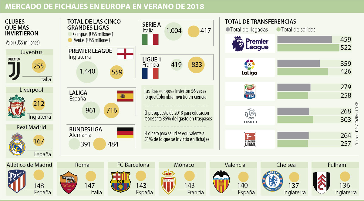 La suma total de las compras de la Premier League de Inglaterra, la Serie A de Italia, LaLiga de España, la Ligue 1 de Francia y la Bundesliga de Alemania abarcan 56 veces el presupuesto del sector de la ciencia en Colombia para este año, que equivalió a US$74 millones, según las cifras del Ministerio de Hacienda.