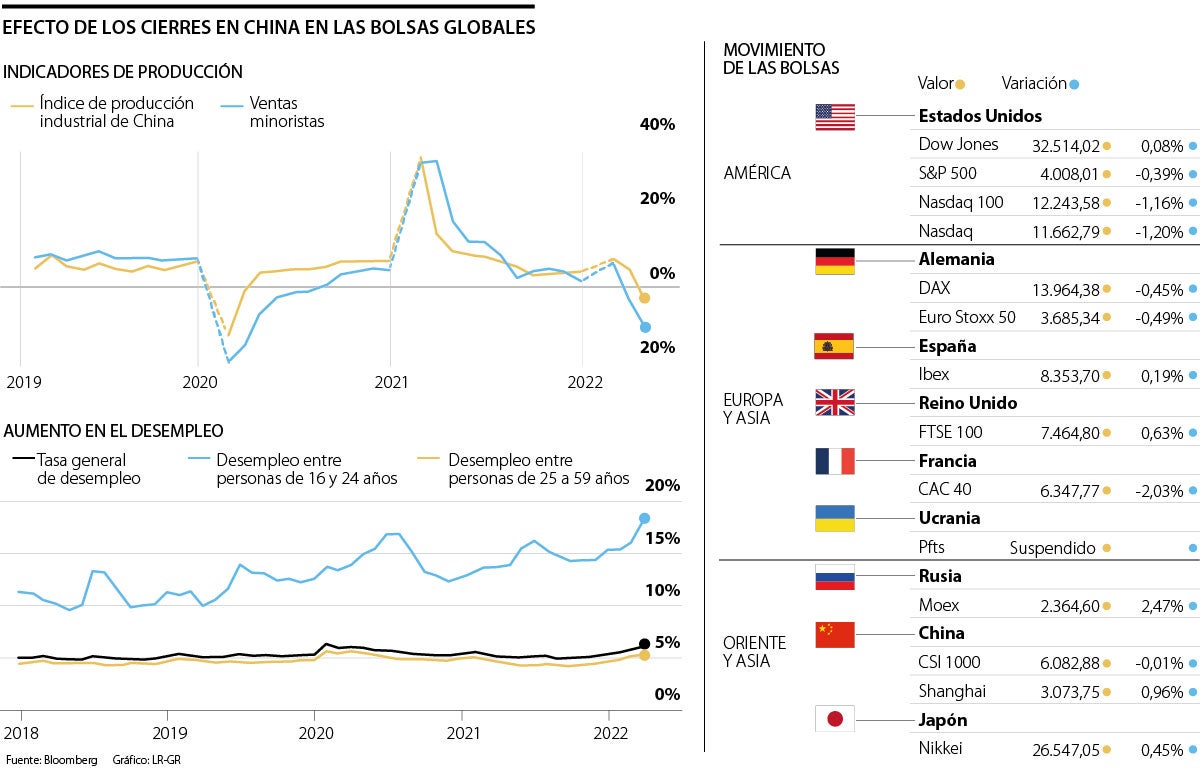 Ayer era un día en el que los mercados del mundo iban a revisar resultados de industria, comercio y empleo de China, pues se trata de un primer diagnóstico de los dos meses en los que ciudades principales están bajo confinamiento por los rebrotes de covid.
