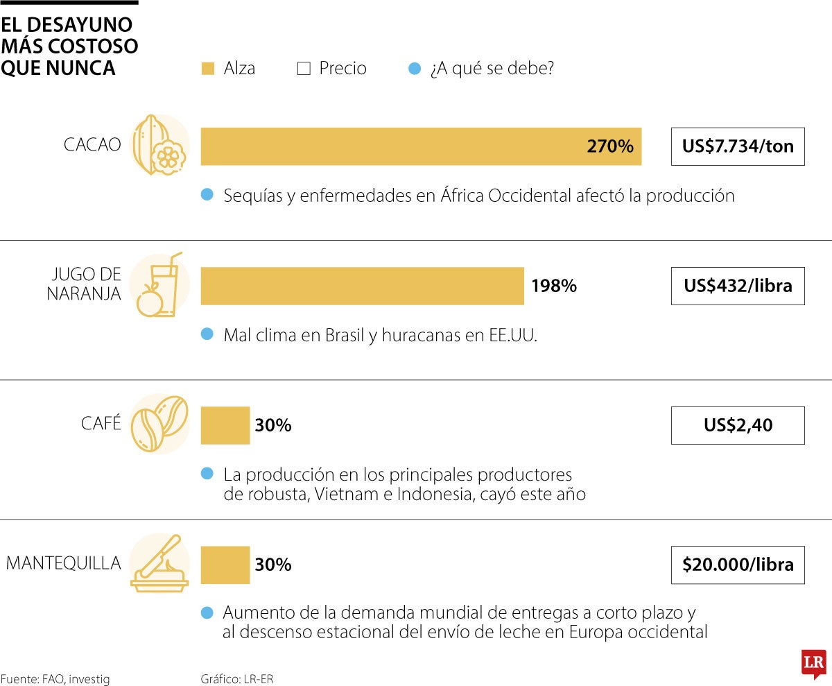 Las materias primas que usted utiliza para el desayuno, como el cacao y el café, el jugo de naranja y hasta la mantequilla, han alcanzado máximos históricos, y todos coinciden en una misma razón: el clima está afectando todas las cosechas del mundo.