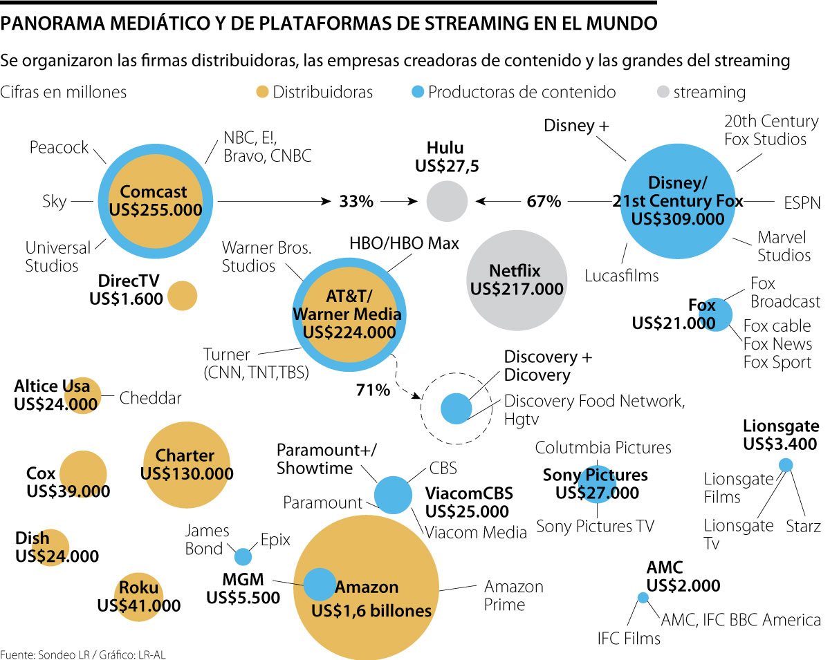 Entre los más grandes del mercado, se ubicó también la fusión entre AT&T, Warner y Discovery, que alcanzará un valor de mercado de US$224.000 millones con la propiedad de Warner Bros Studios, HBO y HBO+, además de los canales de Discovery.