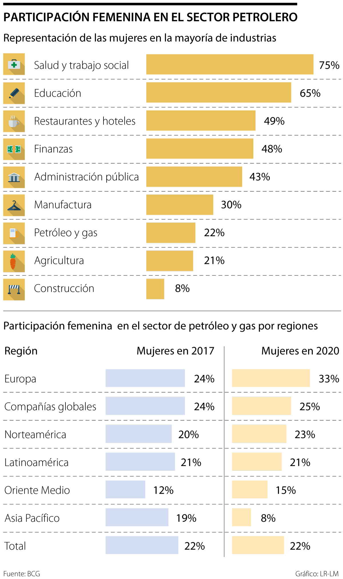 Según un estudio realizado en conjunto entre Boston Consulting Group (BCG) y el World Petroleum Council, las empresas petroleras a nivel mundial solo tienen 22% de su fuerza laboral con participación femenina, porcentaje que se ha mantenido estancado desde 2017.