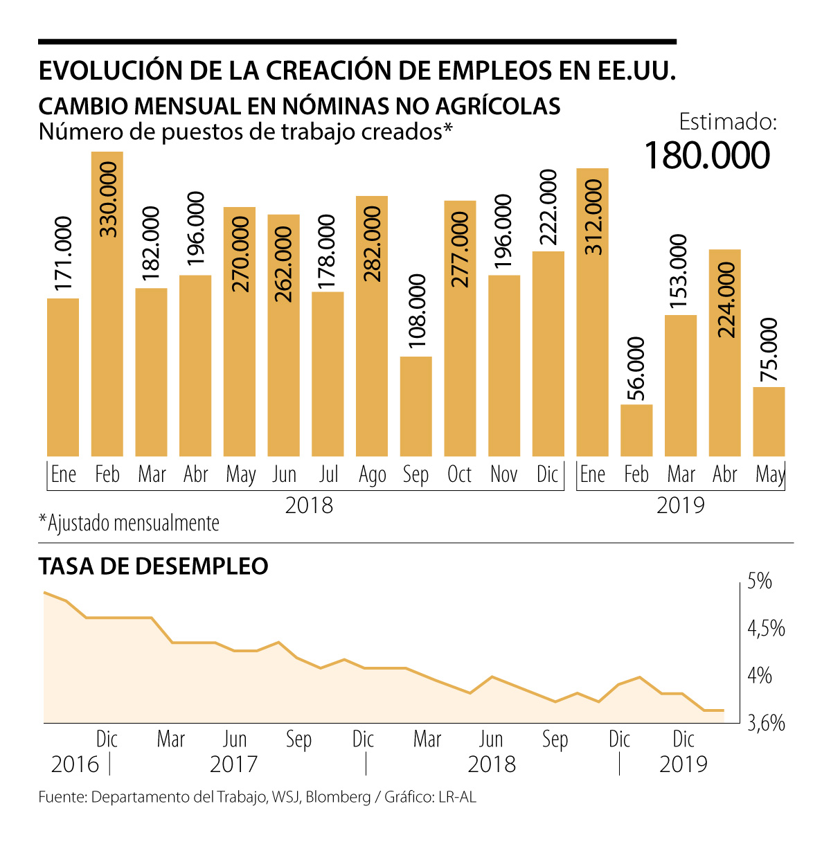 Las nóminas no agrícolas aumentaron en 75.000 en mayo luego de un avance revisado a la baja de 224.000 el mes anterior, según un informe del Departamento de Trabajo realizado el viernes. El aumento omitió todas las estimaciones en la encuesta de Bloomberg que proyectaban 175.000. La tasa de desempleo se mantuvo en un mínimo de 49 años del 3,6%, mientras que las ganancias promedio por hora subieron un 3,1% respecto al año anterior, menos de lo proyectado.