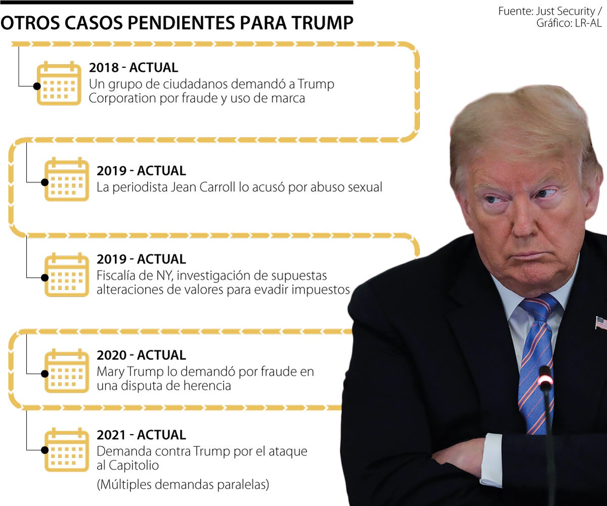 Un reporte de Just Security mostró que tanto en el frente de litigios penales como civiles, el expresidente enfrenta una gran cantidad de juicios e investigaciones, y es probable que sigan más casos. Algunas son demandas civiles derivadas de sus negocios anteriores a la presidencia. Otros son reclamos por difamación de mujeres a las que supuestamente agredió. Más aún son las investigaciones penales y las acciones civiles que escudriñan sus intentos de anular los resultados de las elecciones de 2020.