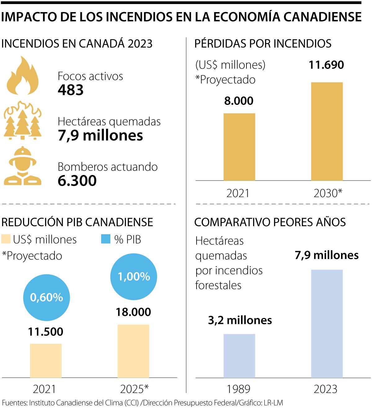 Al tiempo que el Instituto Canadiense del Clima (CCI) estima que la recurrencia de estos incendios y de otros desastres naturales, reducirán la economía nacional unos US$19.000 millones anuales para 2025, equivalentes hoy a más un punto del PIB.