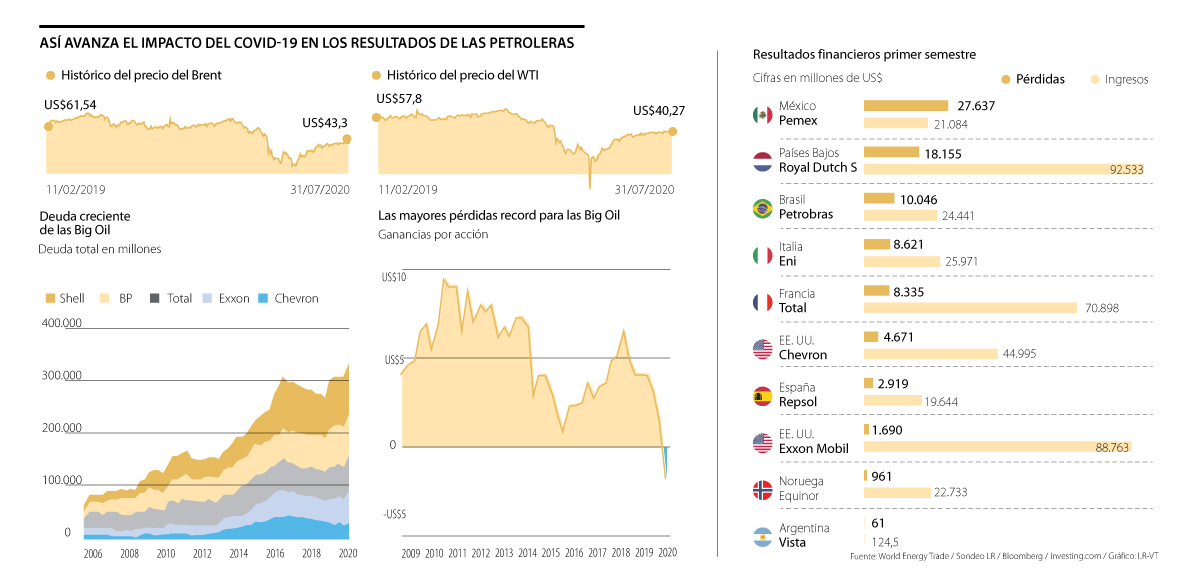 A esto se le suma que las grandes firmas petroleras del mundo han tenido que adicionar decenas de billones de dólares en deuda en sus balances para mantener su producción en medio de la crisis que ha generado el covid-19, según información publicada por World Energy Trade que también destacó que “las siete principales firmas energéticas del mundo, BP, Shell, ExxonMobil, Chevron, Equinor, Total y Eni, recaudaron más de US$60.000 millones en deuda en el segundo trimestre de 2020, casi la mitad de US$132.000 millones en préstamos de todo el sector petróleo y gas durante el período”.